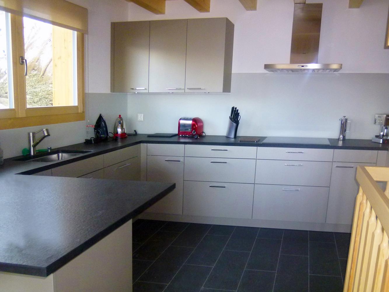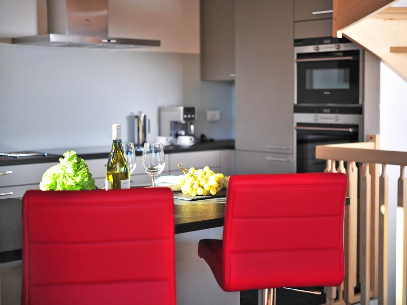 Küche zum Wohnraum offen (Spülmaschine + Kühlschrank mit Gefrierfach + Induktionsherd + Backofen + Mikrowelle + Kaffeemaschine + Toaster + Wasserkocher + Mixer); Kaminofen; 2 Smart TV; DVD-Player; Stereoanlage; Gratis-WLAN; Waschmaschine; Wäschetrockner; 2 Terrassen; 3 Balkone; Skiraum; elektrischer Skischuhtrockner