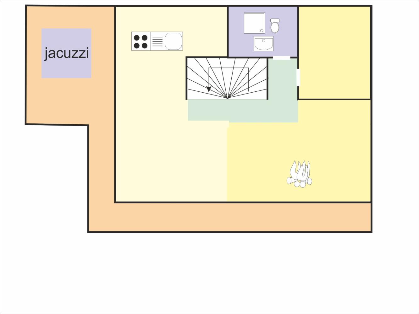 1. Etage: offene Küche, sehr geräumiger Wohn-Essbereich, Arbeits-/TV-Zimmer, Badezimmer.