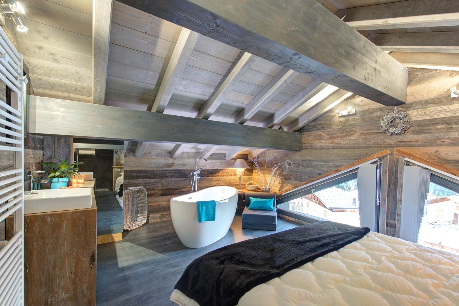 Die Schlafzimmer verteilen sich über 3 Etagen. 6 Schlafzimmer verfügen über ein eigenes en-suite Bad mit Dusche und Waschbecken sowie einen Flatscreen-TV. Ein Schlafzimmer hat eine Badewanne. Alle Betten sind 2 m lang. Es gibt drei separate WC im Chalet. Entspannen Sie sich nach einem Skitag voller Eindrücke im Wellnessbereich mit Privat-Sauna für 4-6 Personen sowie großem Whirlpool, Dusche und Kübeldusche. Zudem gibt es dort eine Bluetooth-Soundbar sowie einen Flatscreen-TV.