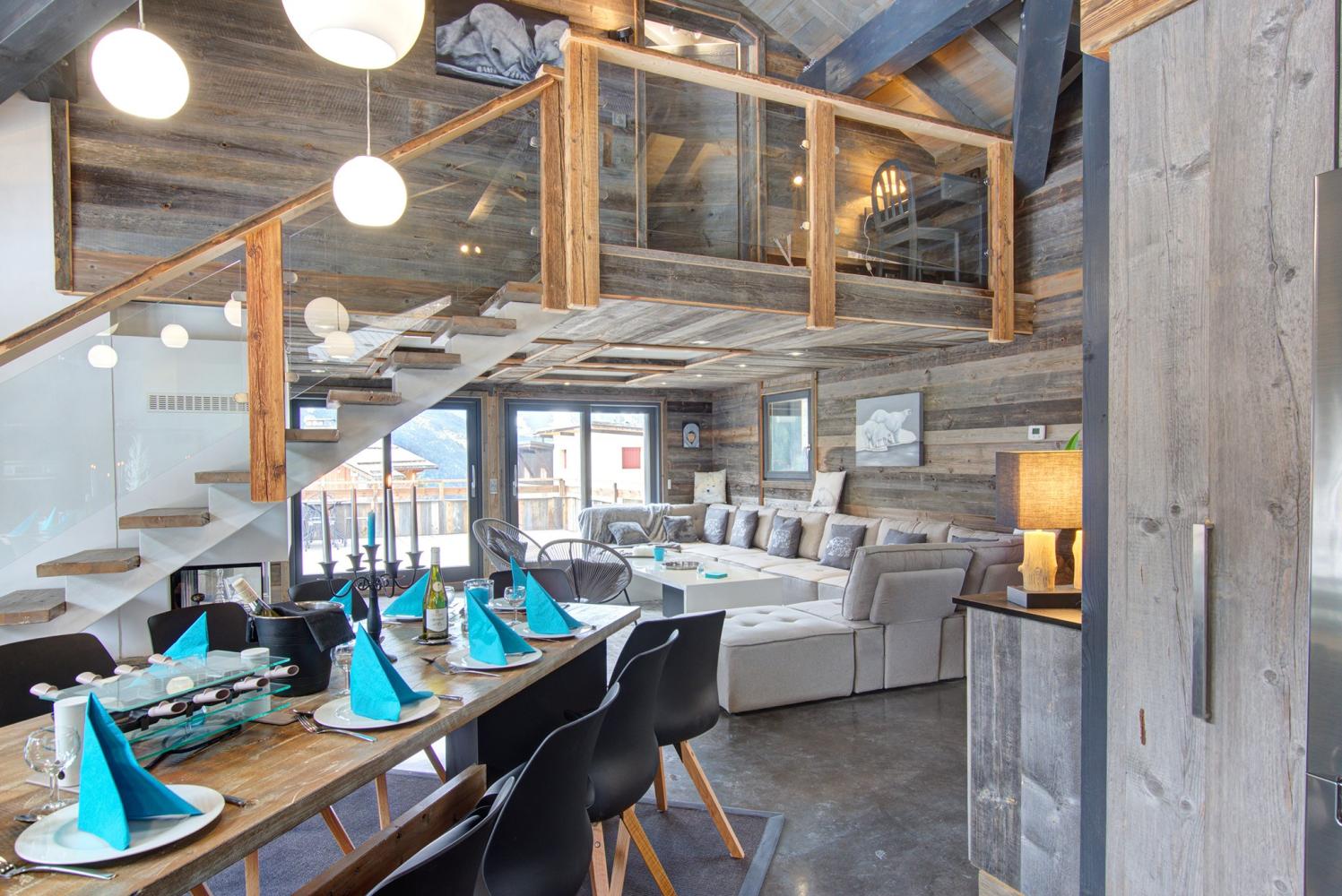 Auf der 1. Etage befindet sich der sehr geräumige Wohn- und Essbereich. Am großen Esstisch haben 18 Personen bequem Platz. Die moderne und komplett ausgestattete Küche mit großem Kühlschrank sowie Raclette- und Fondue-Set lädt zu gemütlichen Chaletabenden ein. Im Wohnraum gibt es zudem ein Home-Cinema-System. Zugang zur sonnigen Süd-Terrasse.