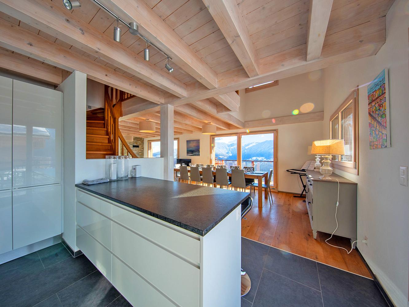 Der geräumige, lichtdurchflutete Wohn-/Essbereich mit Sofalandschaft befindet sich auf der 1. Etage. Entspannen Sie sich vor dem hell lodernden Steinkamin nach einem aktiven Tag in den Bergen. Smart-TV, DVD-Player und Bluetooth Soundbar tragen zur Unterhaltung bei. Von hier aus gelangen Sie auf den großen Panorama-Balkon mit freiem Blick auf die spektakuläre Bergwelt der Walliser Viertausender und des Héremence-Tals. Die moderne, offene Küche ist hochwertig und komplett ausgestattet. Gönnen Sie sich einen Aperitif an der Bar. Am großen Esstisch haben 12 Personen bequem Platz. Zugang zur sonnigen Süd-Terrasse mit Gartenmöbeln. Ein Schlafzimmer mit 2 Einzelbetten sowie ein Badezimmer befinden sich ebenfalls auf der Etage.
