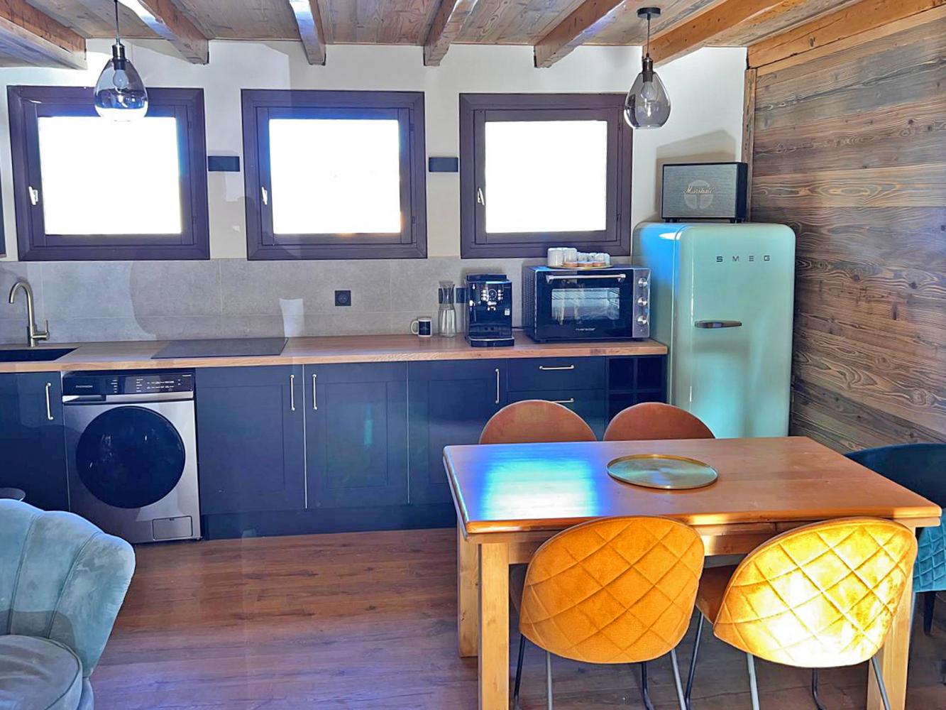 Küche zum Wohnraum offen (Spülmaschine + Kühlschrank + Herd + Backofen + Mikrowelle + Kaffeemaschine + Toaster + Wasserkocher); Fernseher; Gratis-WLAN; Waschmaschine