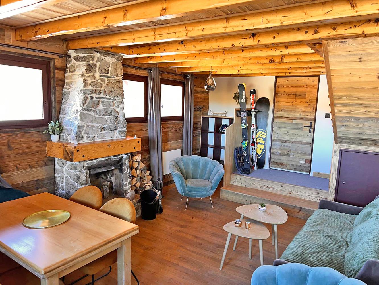 Level 1: Eingangsbereich mit Skischrank. Gemütlicher, offener Wohn- und Essbereich mit Schlafsofa für 2 Personen, Kamin und TV. Gut ausgestattete Küche.
