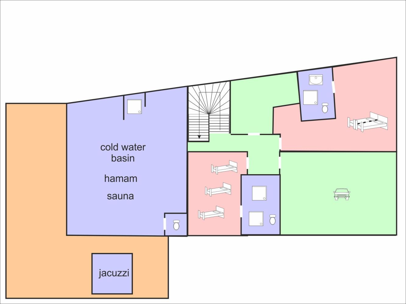 Auf der mittleren Etage gibt es 5 Schlafzimmer: zwei Doppelzimmer mit Doppelbett (180 x 200 cm); drei Doppelzimmer mit Einzelbetten, zum Doppelbett verbindbar (jeweils 90 x 200 cm). Sämtliche Zimmer verfügen über ein eigenes Badezimmer, vier mit Dusche, Waschbecken und WC, eines mit Badewanne (mit Whirlpoolfunktion), Waschbecken und WC.