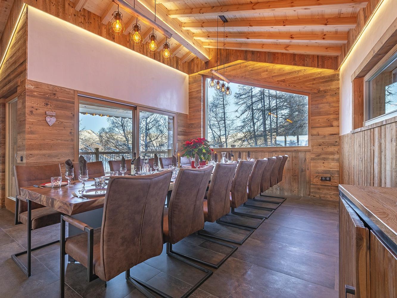 auf der oberen Etage befindet sich der großzügige, hohe Wohnraum mit offener Dachbalkenkonstruktion mit dem gemütlichen Sofabereich am Kaminfeuer. Bluetooth-Musiksystem. Sat-Flatscreen-TV mit 160 cm Bilddiagonale. Am großen Tisch im Licht durchfluteten Essbereich finden 15 Personen bequem Platz. Moderne, komplett für 15 Personen eingerichtete, offene Küche. Zugang zur großen Panoramaterrasse mit weitem Blick auf den Mont Blanc sowie Beaufortain-Berge und das Tarentaisetal; hochwertiger Gasgrill.