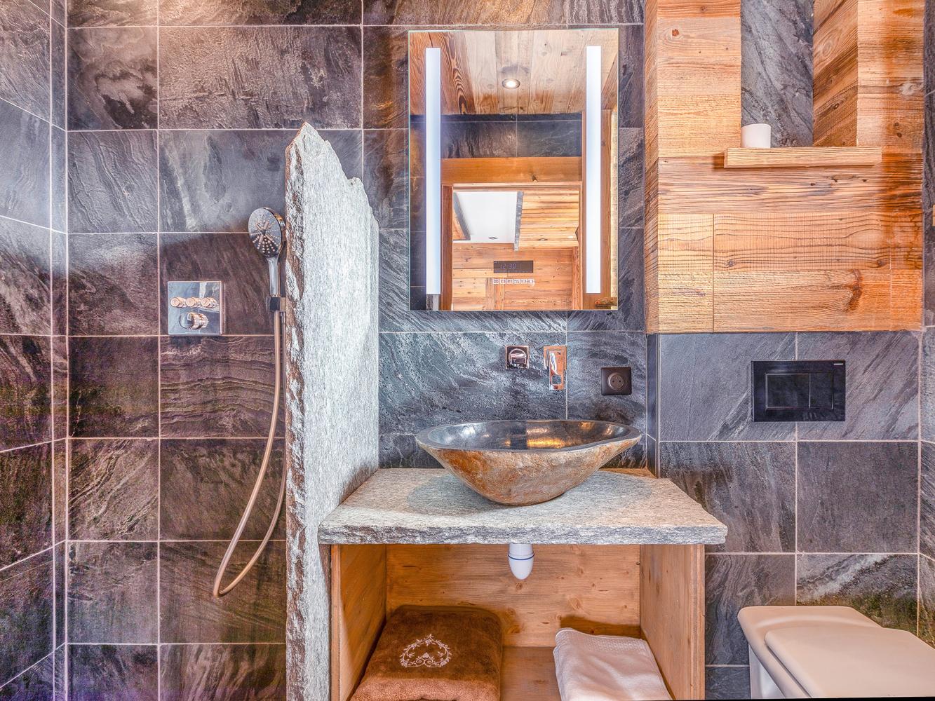Im Erdgeschoss ist der Haupteingang des Chalets. Hier befindet sich ein Doppelzimmer mit Einzelbetten, zum Doppelbett verbindbar (90 x 200 cm); ein Dreibettzimmer mit einem Doppelbett (180 x 200 cm) und einem Einzelbett (90 x 200 cm). Beide Zimmer verfügen über ein eigenes Bad mit Dusche, Waschbecken und WC.
