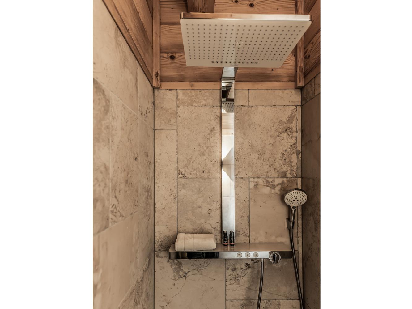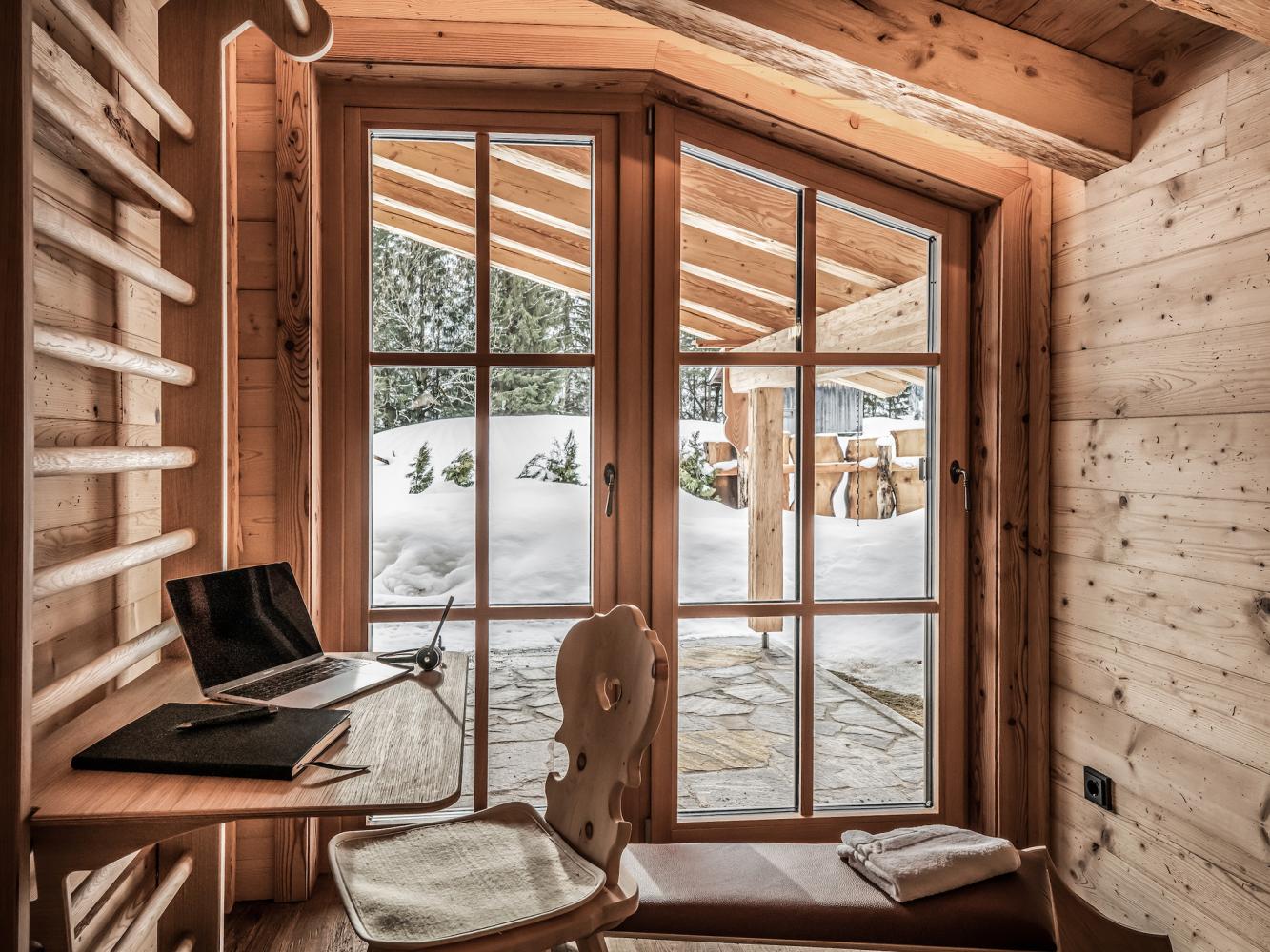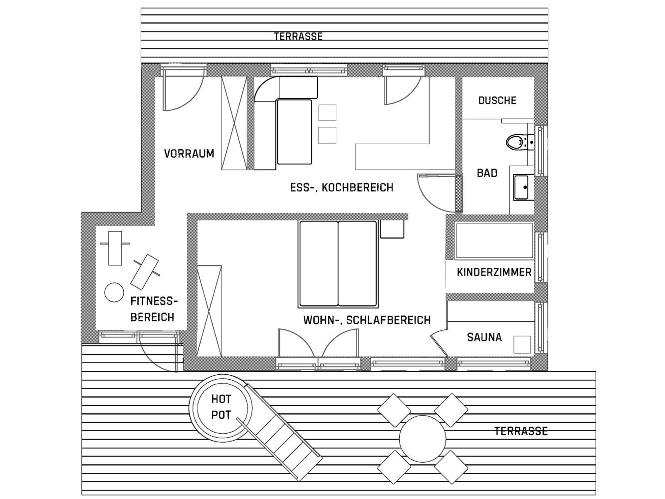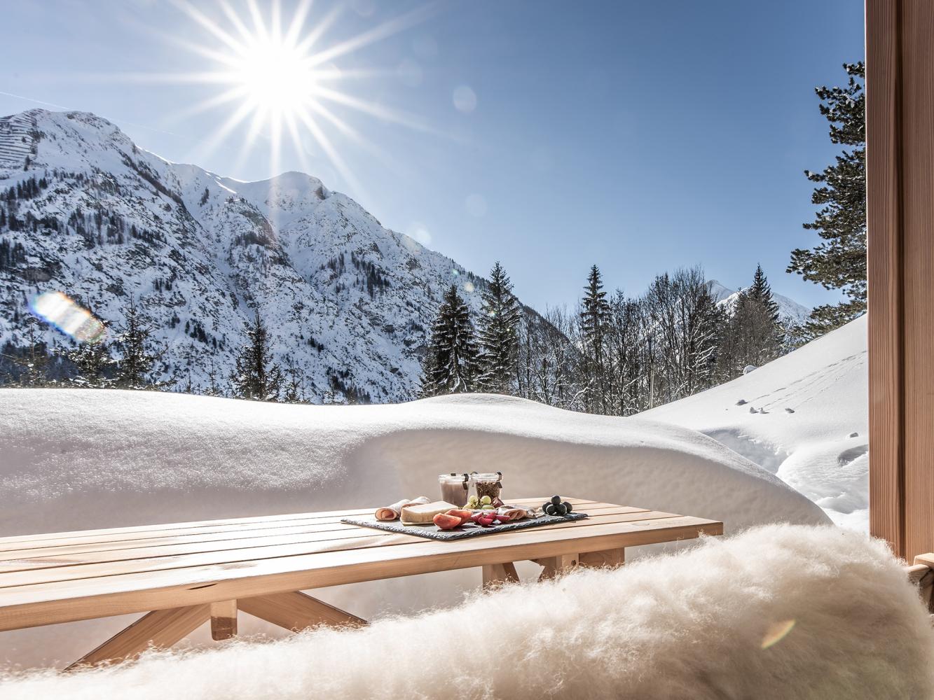 Außen-Hot Pot. Dieser befüllt sich auf Knopfdruck mit warmen Bergquellwasser. Bademäntel und Handtücher werden kostenfrei zur Verfügung gestellt. Im Chalet gibt es zudem ein MOVEit Bluetooth Soundsystem, ein Suitepad mit aktuellen Zeitungen und Spielen sowie eine Spielesammlung mit Gesellschaftsspielen. Genießen Sie die Natur auf der großzügigen