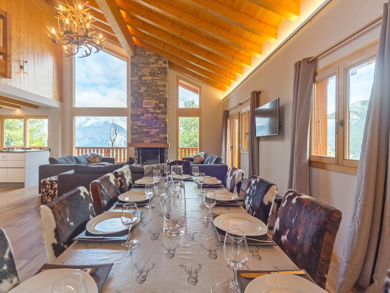 Very impressive living-/ and dining area with panoramic views and a modern fireplace. The new state-of-the-art kitchen invites to great cooking evenings. Five of the seven bedrooms are 'en suite' with their own bathroom. Six bedrooms have access to terrace or balcony. The entrance/parking area of the chalet is secured by an outside surveillance camera.