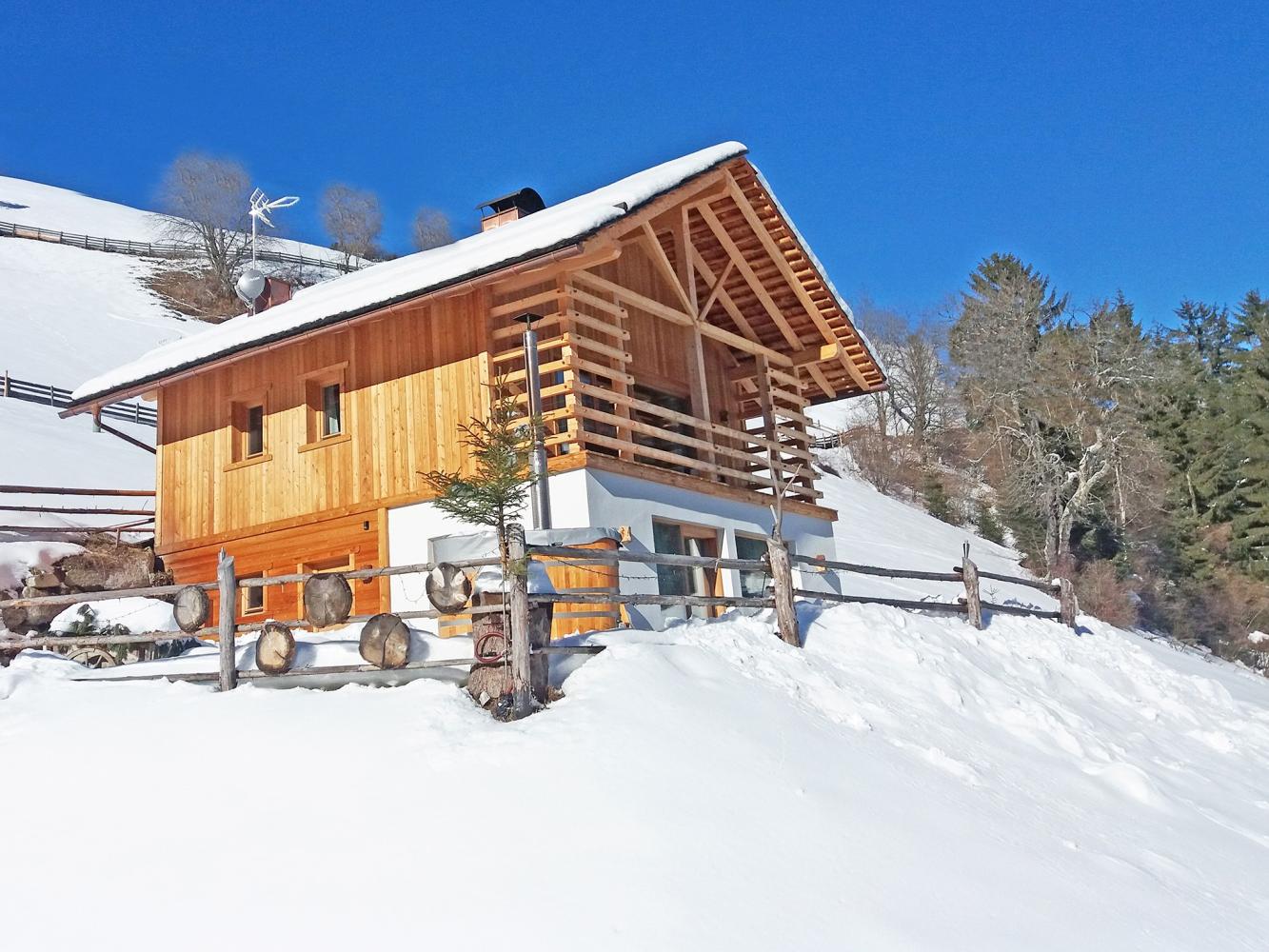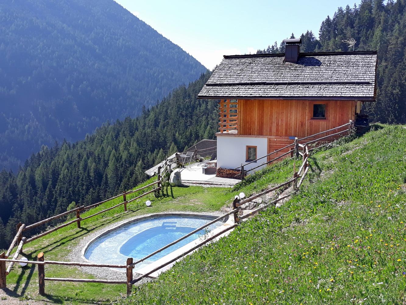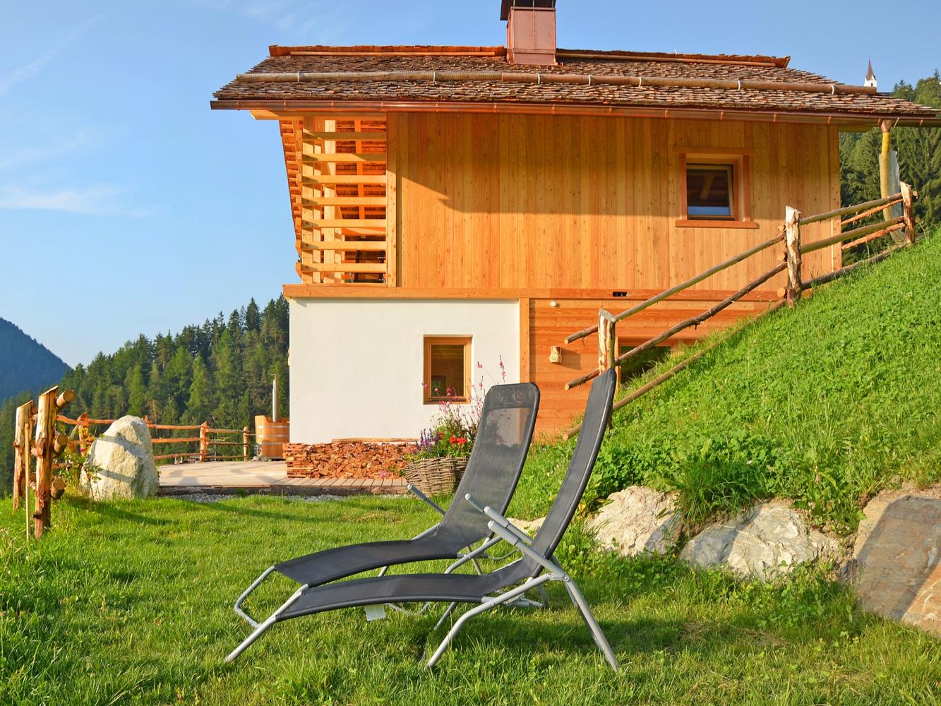 Distance to ski area Dolomiti Superski ~7 km. Newly constructed luxury chalet with free WiFi, fireplace, infrared sauna, hay bed and hot tub heated with wood; as well as an natural swimming pond. For the construction of the holiday lodge, only natural, chemical-free and high-quality materials have been used. The chalet built in wood construction is located in a beautiful secluded location at the end of a driveway, situated on a hillside above the Val Badia, south of Bruneck / Puster Valley (~15 km). Ideal for people looking for sports activities as well as recreation – the chalet is located in the middle of nature and surrounded by meadows and forest areas.