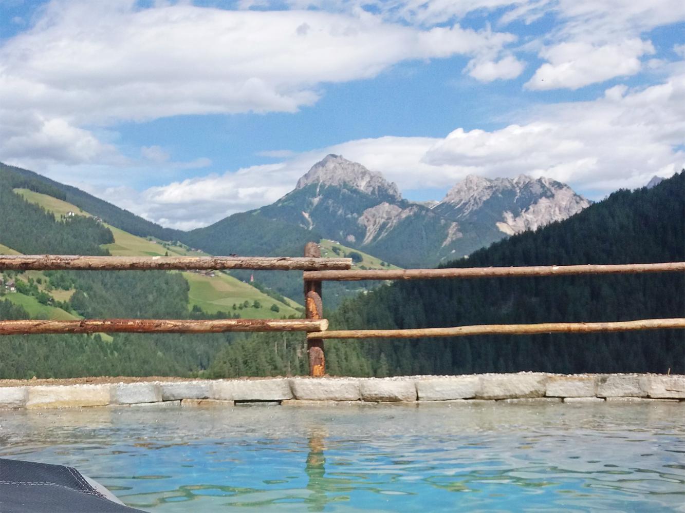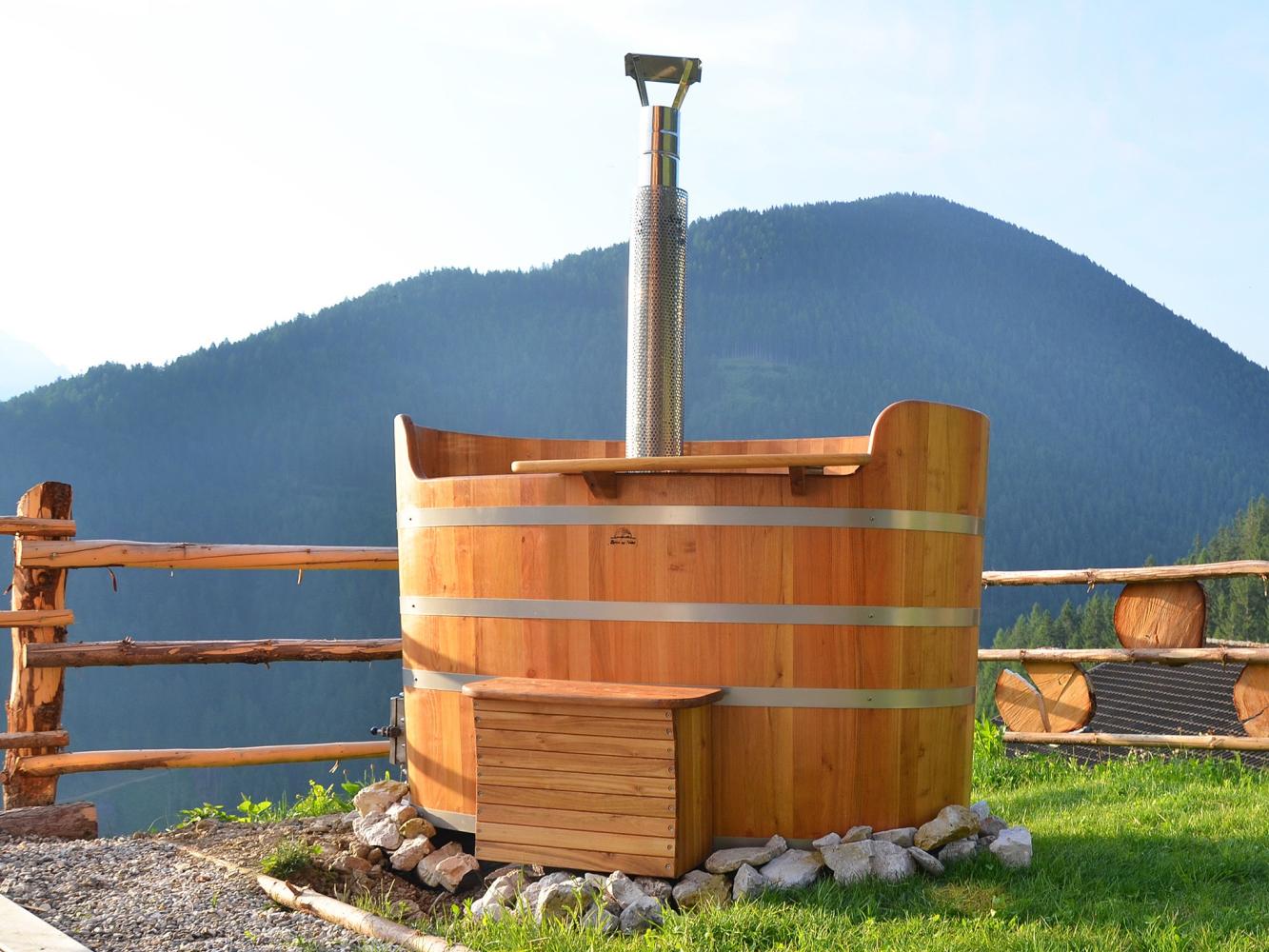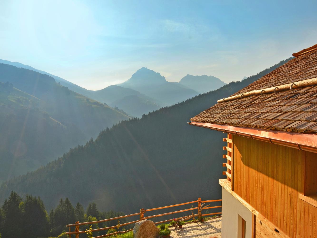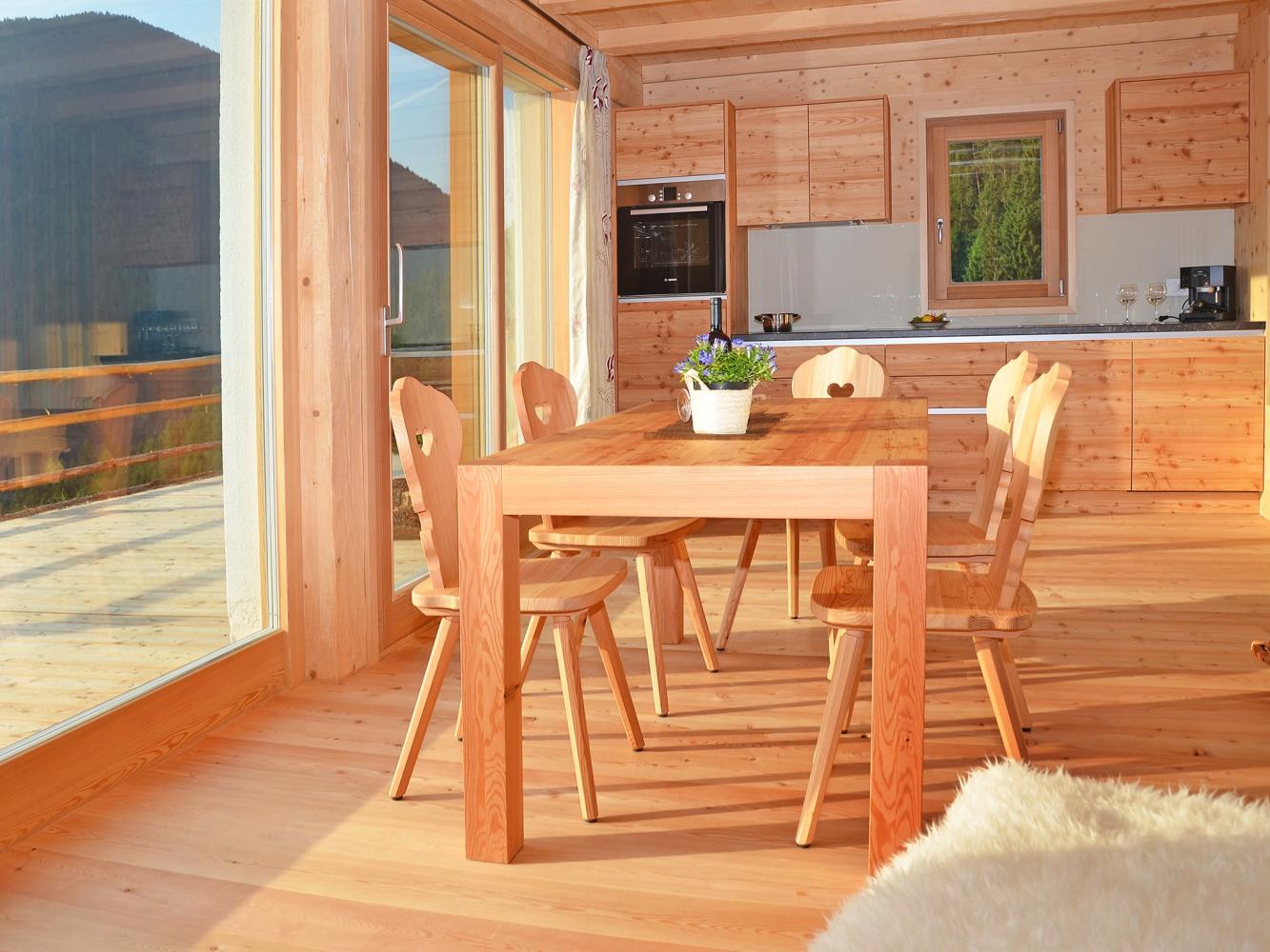 Distance to ski area Dolomiti Superski ~7 km. Newly constructed luxury chalet with free WiFi, fireplace, infrared sauna, hay bed and hot tub heated with wood; as well as an natural swimming pond. For the construction of the holiday lodge, only natural, chemical-free and high-quality materials have been used. The chalet built in wood construction is located in a beautiful secluded location at the end of a driveway, situated on a hillside above the Val Badia, south of Bruneck / Puster Valley (~15 km). Ideal for people looking for sports activities as well as recreation – the chalet is located in the middle of nature and surrounded by meadows and forest areas.