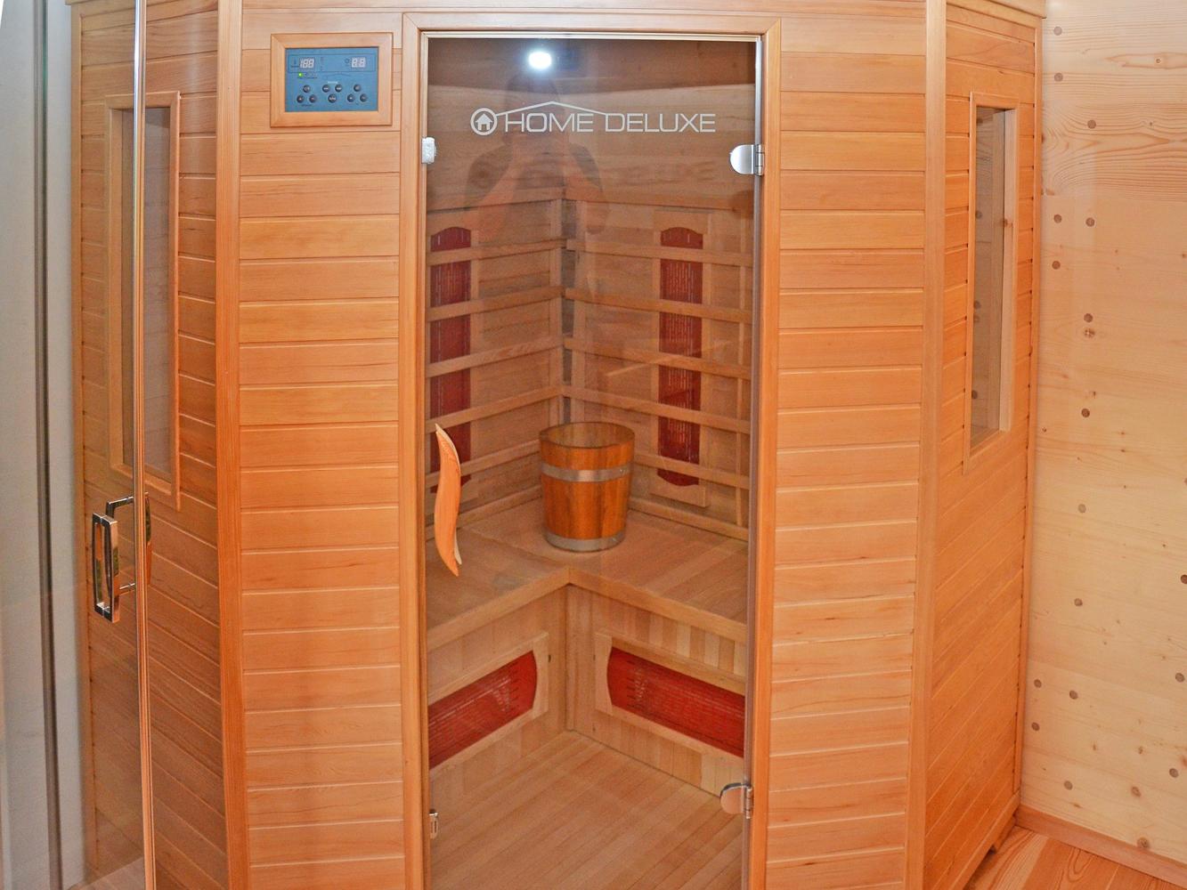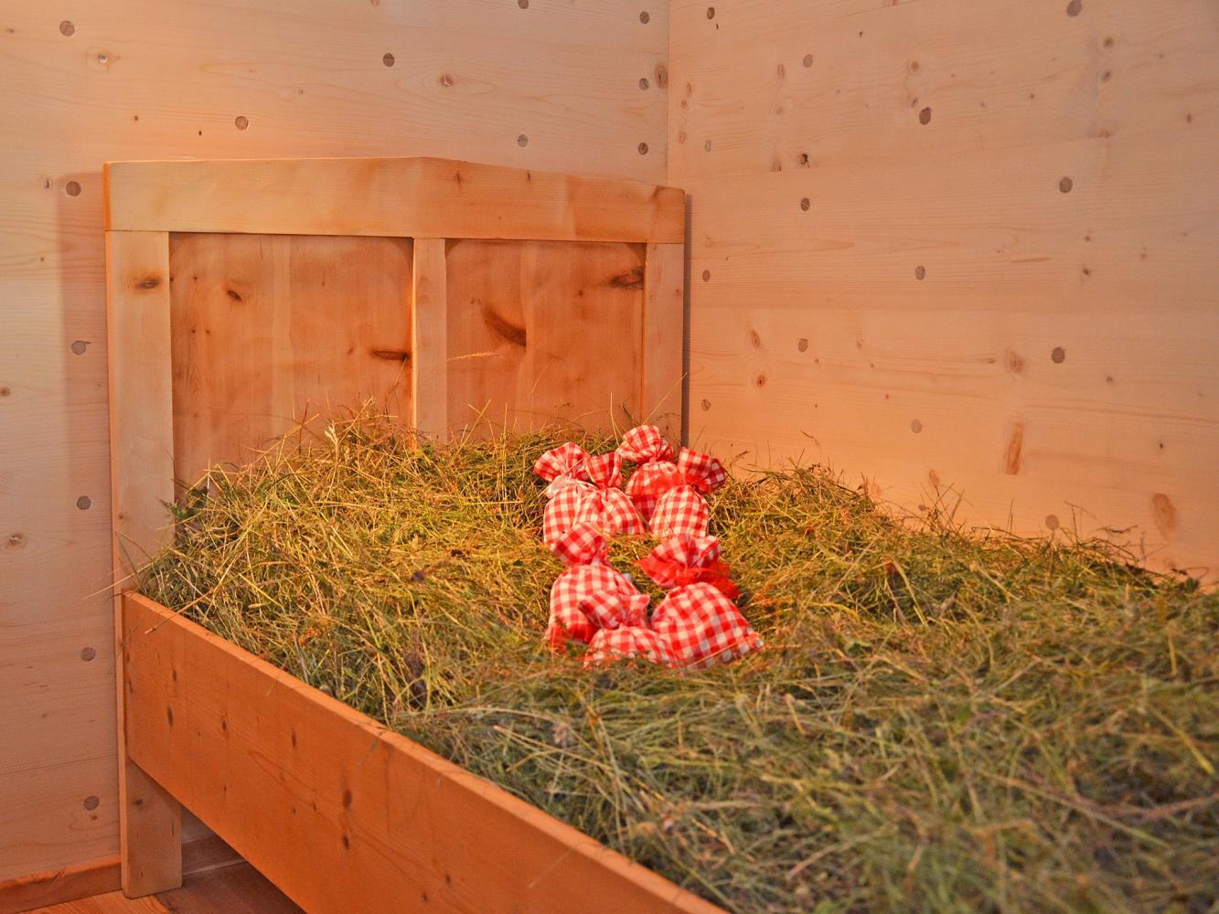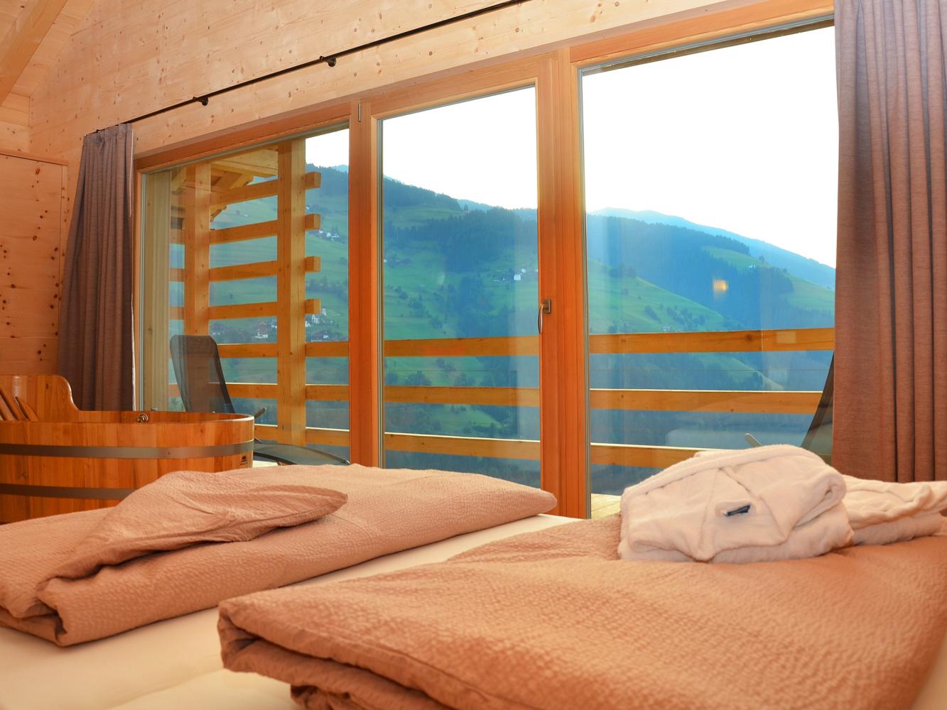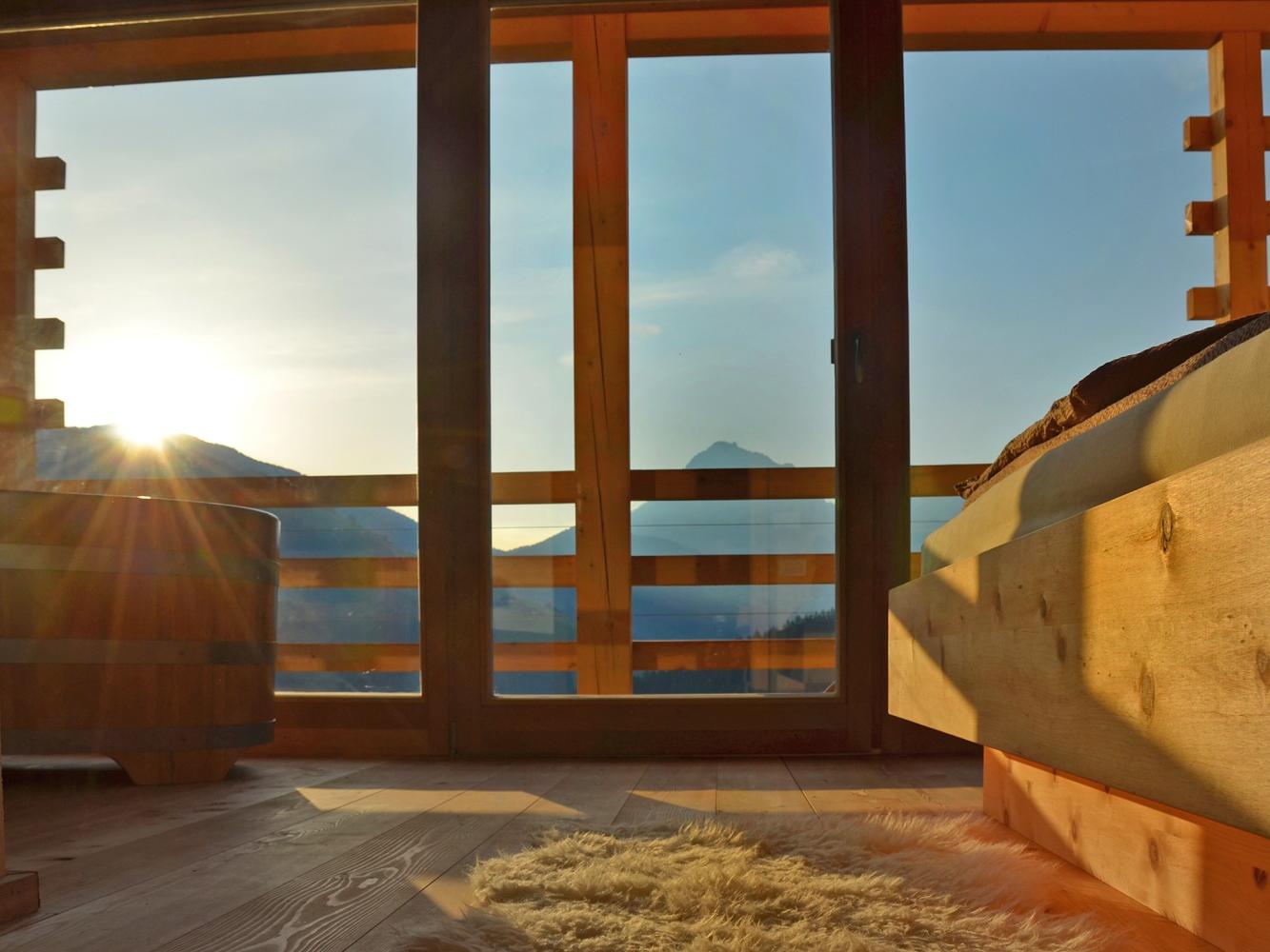 First floor: master bedroom with fireplace and freestanding wooden bathtub from where you can enjoy a stunning view on the mountain world of the Dolomites. Direct access to the spa area. Unwind in the hay bed and infrared sauna.