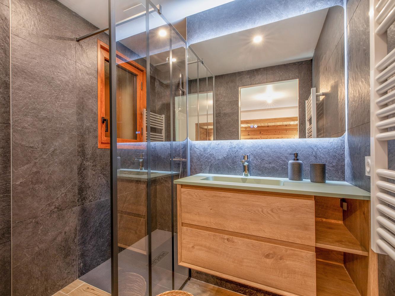 After a nice day on the slopes, you can relax in the sauna (4 pers.) on the lower floor. Here you will find another bedroom with 3 beds (90 x 190 cm) and a bathroom with rain shower. Separate WC. A ski room with wardrobe and boot dryer is located at the entrance of the chalet on the ground floor.