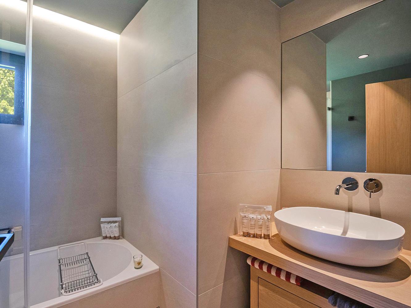 The remaining bedrooms are on the 1st floor: two bedrooms with double bed (each 160 x 200 cm) and two bedrooms with 2 single beds (90 x 190 cm, can be pushed together). Three of these bedrooms have an en-suite bathroom. There are also an open reading area with a fireplace (mezzanine above the living room) and 2 separate WCs located on this floor.