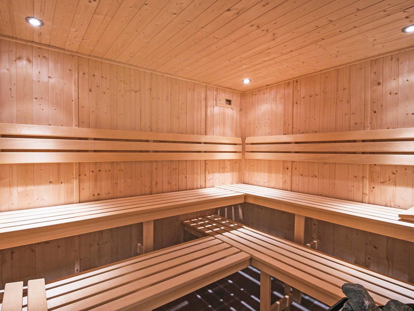 The sauna area with shower + separate WC as well as the laundry room and the ski room are located on the lower floor. Slippers included. The ground floor is the centre of the chalet, with the open-plan living/dining area and fully equipped kitchen. The fully glazed façade allows a magnificent view of the surrounding mountains. Access to the large garden with garden furniture. On this floor there is a bedroom with a double bed (150 x 200 cm) and en-suite bathroom (shower, bath, washbasin). There is also a bedroom for the children (2 bunk beds, each 80 x 200 cm) with en-suite bathroom (shower, washbasin). 2 separate WCs and a TV room with wood-burning stove are also on this floor.