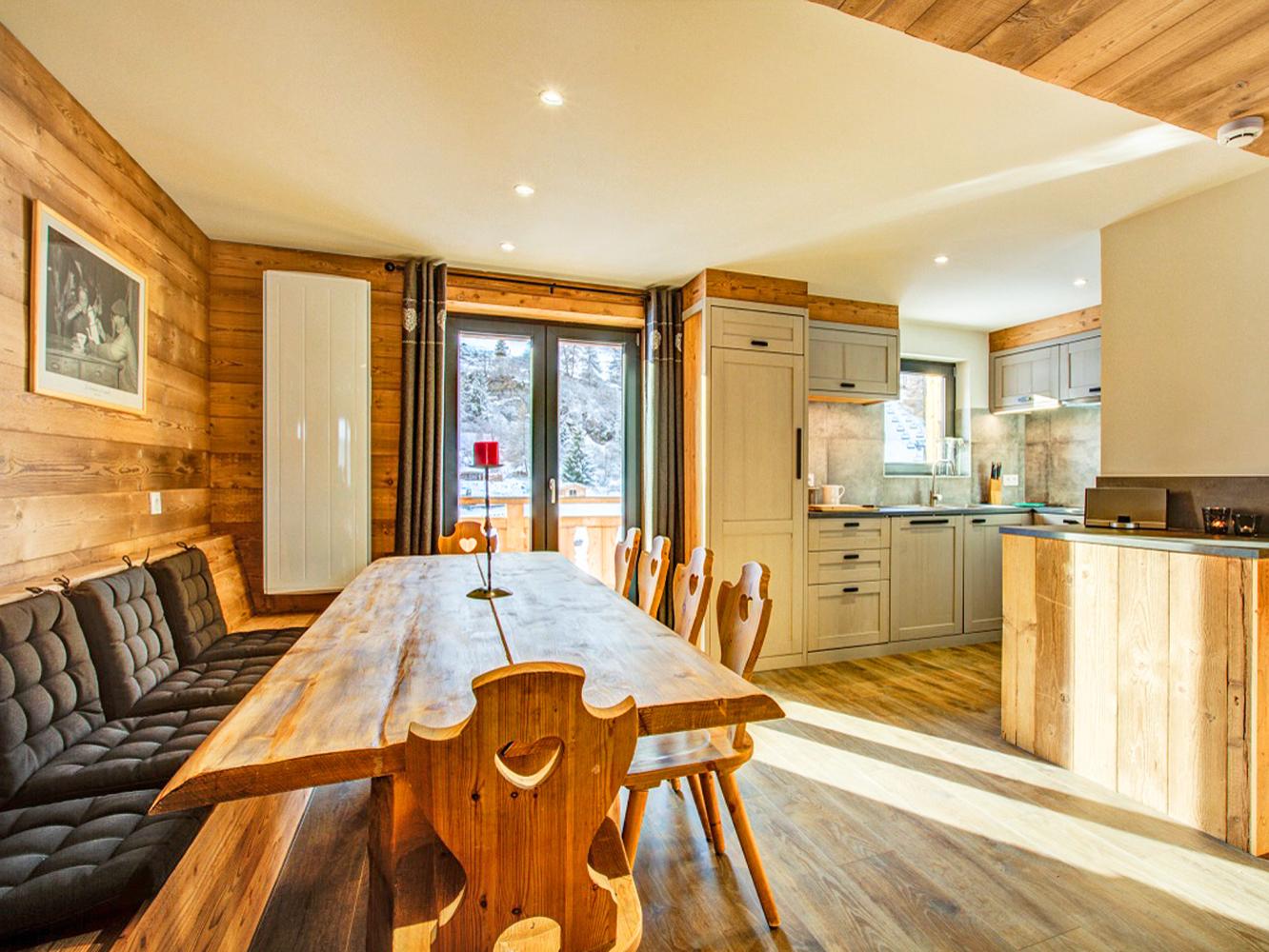 Ground floor: On this floor is the entry hall with boot dryer. Enjoy the charming open-plan living room with corner sofas, 2 armchairs, flat-screen TV. Fully equipped kitchen and dining area with a table that comfortably seats 10. The spacious lounge offers stunning views of the slopes from the balcony.
