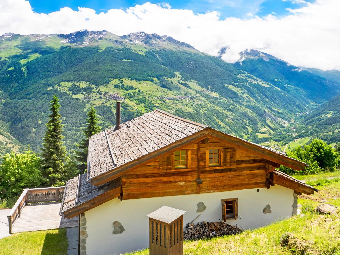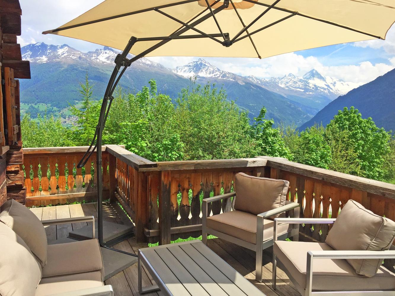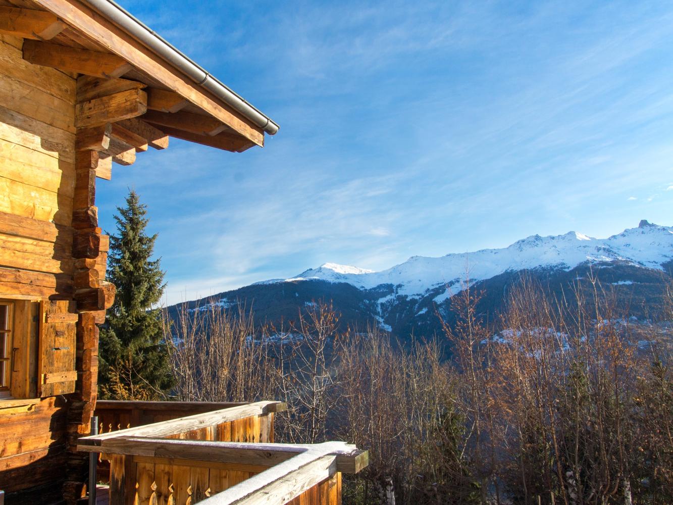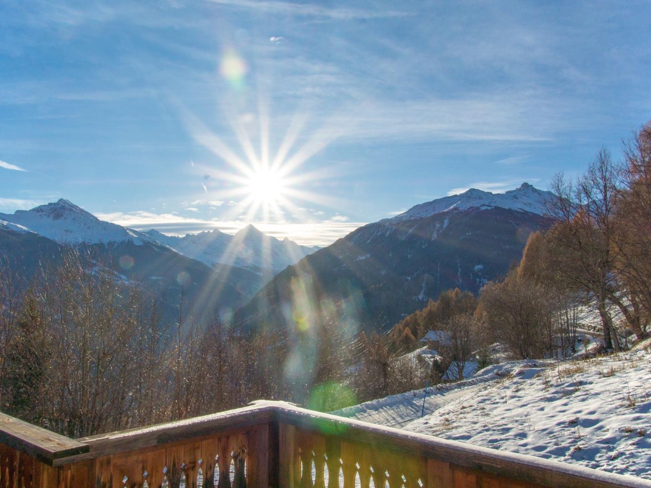 The large open-plan living/dining area with balcony and two terraces attached offers amazing views over the Matterhorn and Dent Blanche summits and the Héremence valley. Very well-equipped kitchen. Five bedrooms; large master bedroom with bathroom en-suite. Two private parking spaces available directly in front of the chalet.