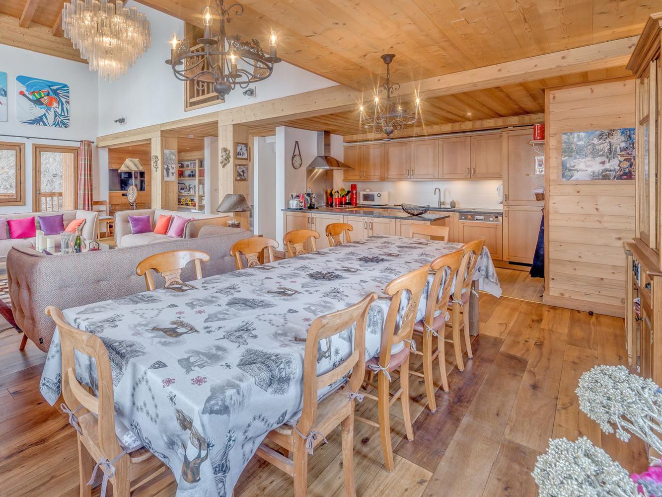 Première étage : Salon/salle à manger spacieux avec des grandes fenêtres panoramiques. Séjour avec canapés, fauteuils et grande cheminée. Deuxième séjour/coin télévision avec canapé, système home cinéma, ainsi qu’une petite bibliothèque et des jeux de société. WC séparé. La cuisine ouverte est équipée de façon très complète. La table à manger peut accueillir 12 personnes confortablement. Accès au balcon-terrasse, orienté sud/sud-ouest.