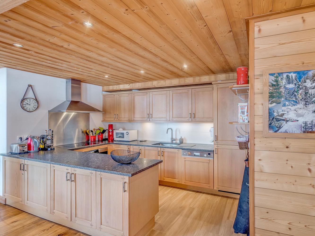 cuisine ouverte vers le séjour (lave-vaisselle + réfrigérateur + réfrigérateur avec congélateur + 4 plaques vitro-céramiques + four + micro-onde + cafetière + machine à café à capsules Nespresso + grille-pain + bouilloire électrique); cheminée; TV-satellite (écran plat); TV-satellite dans toutes les chambres; wifi gratuit; sèche-serviettes; lave-linge; sèche-linge; terrasse balcon; local à ski; sèche-chaussures
