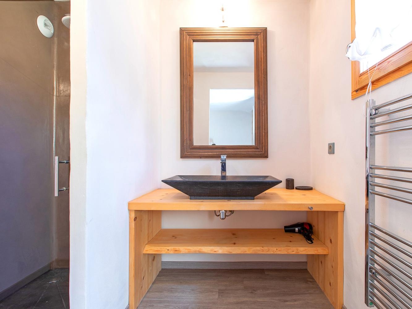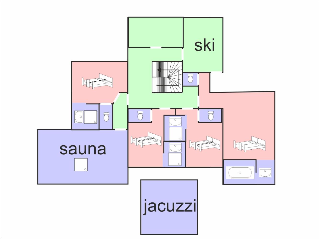 Au rez-de-chaussée se trouvent 3 chambres doubles avec salle de bain privée "en suite" avec douche et WC séparé, une chambre double spacieuse avec sa propre salle de bain "en suite" avec baignoire d'angle, WC séparé, de grandes fenêtres panoramiques avec une vue magnifique sur la vallée et les montagnes ainsi qu'une sortie sur le jardin. Au même niveau se trouve également un espace bien-être lumineux et spacieux avec sauna, douche et chaises longues ainsi qu'une sortie sur le jardin avec jacuzzi extérieur. Un local à skis avec sèche-chaussures et une entrée séparée complètent cet étage.