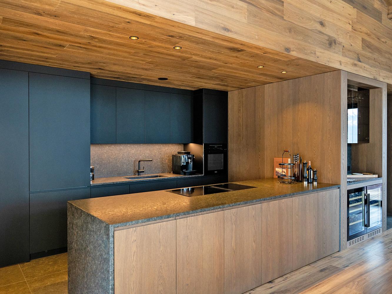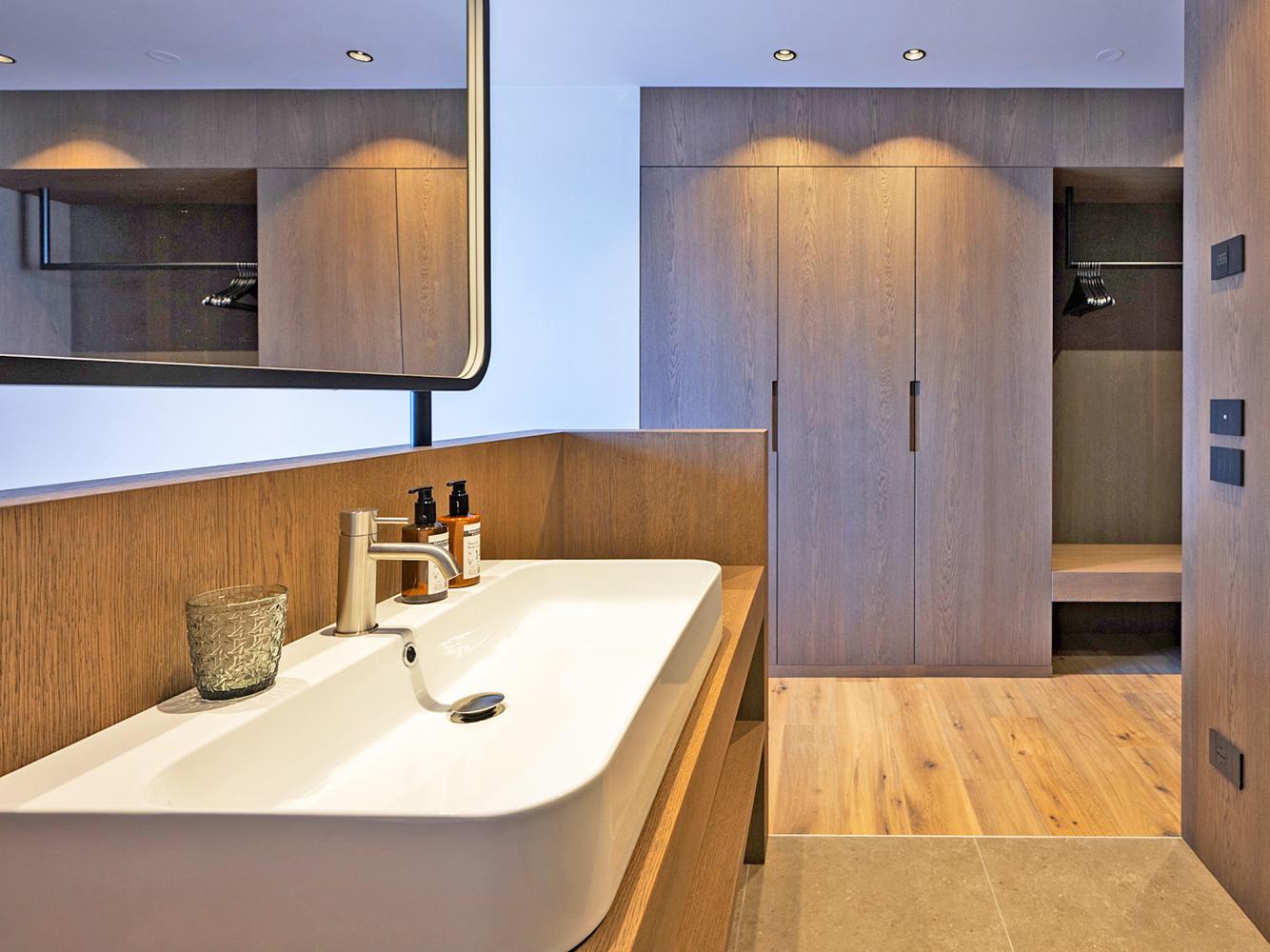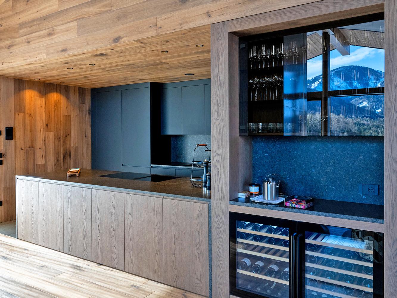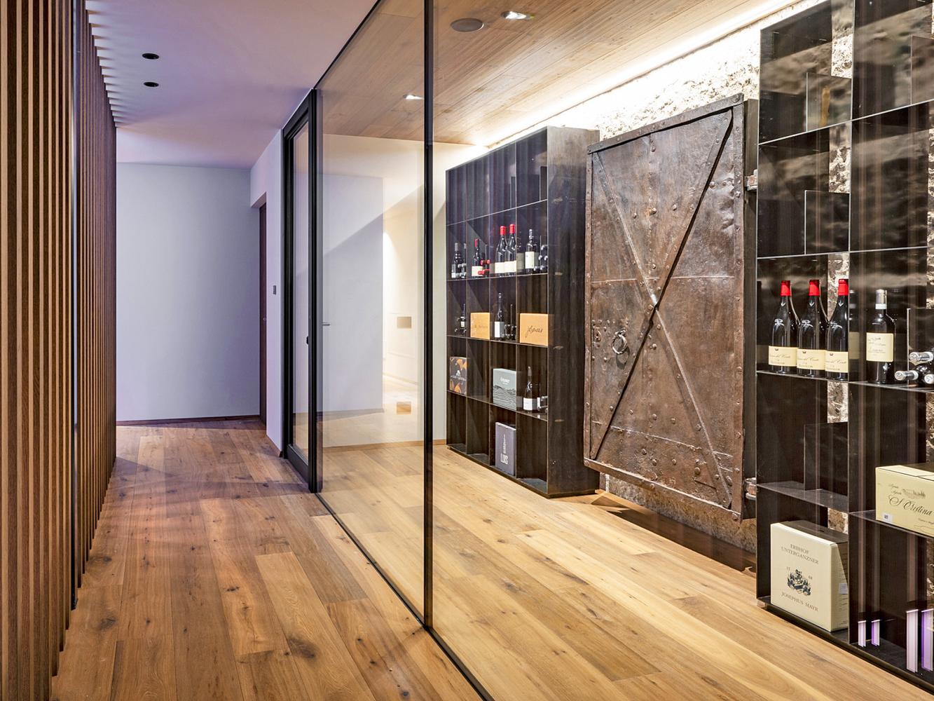 Les deux terrasses sont accessibles depuis le salon. À cet étage se trouvent également un local à skis chauffé avec un sèche-chaussures ainsi que des emplacements pour vélos et une station de recharge pour vélos électriques. L'armoire à vin avec façade en verre attire particulièrement l'attention : vous y trouverez une sélection de vins du Tyrol du Sud et d'Italie (payant).