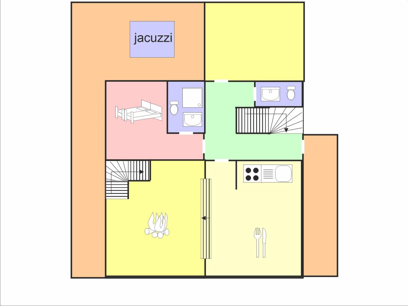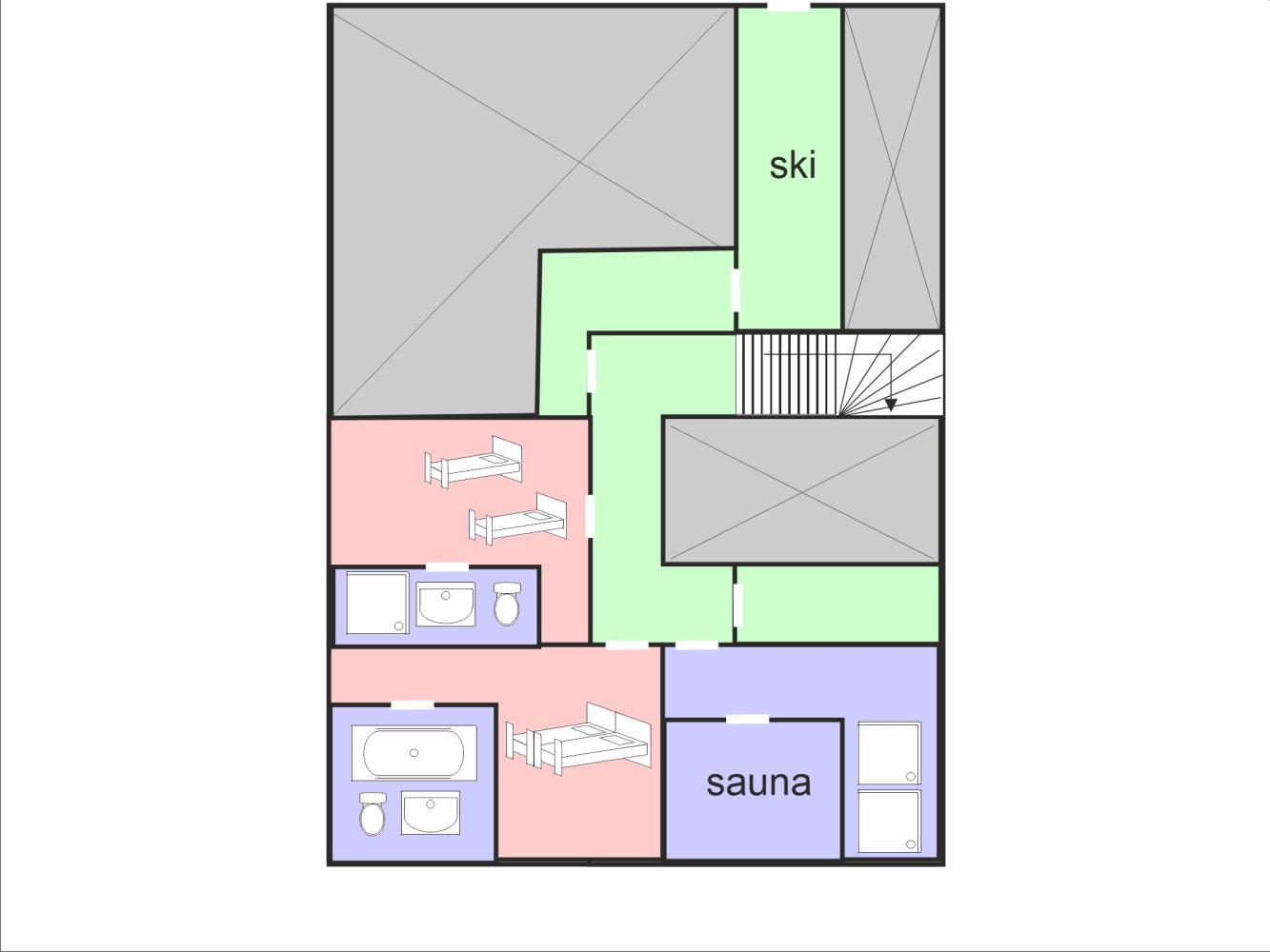 Rez-de-chaussée : à cet étage se trouve un sauna spacieux pour 4 à 6 personnes avec deux douches. Également d'une chambre avec lit double 160 x 200 cm et salle de bain privée. Une autre chambre avec deux lits simples 90 x 200 cm et salle de bain. Depuis le grand parking, on accède directement dans le chalet et le local à skis.
